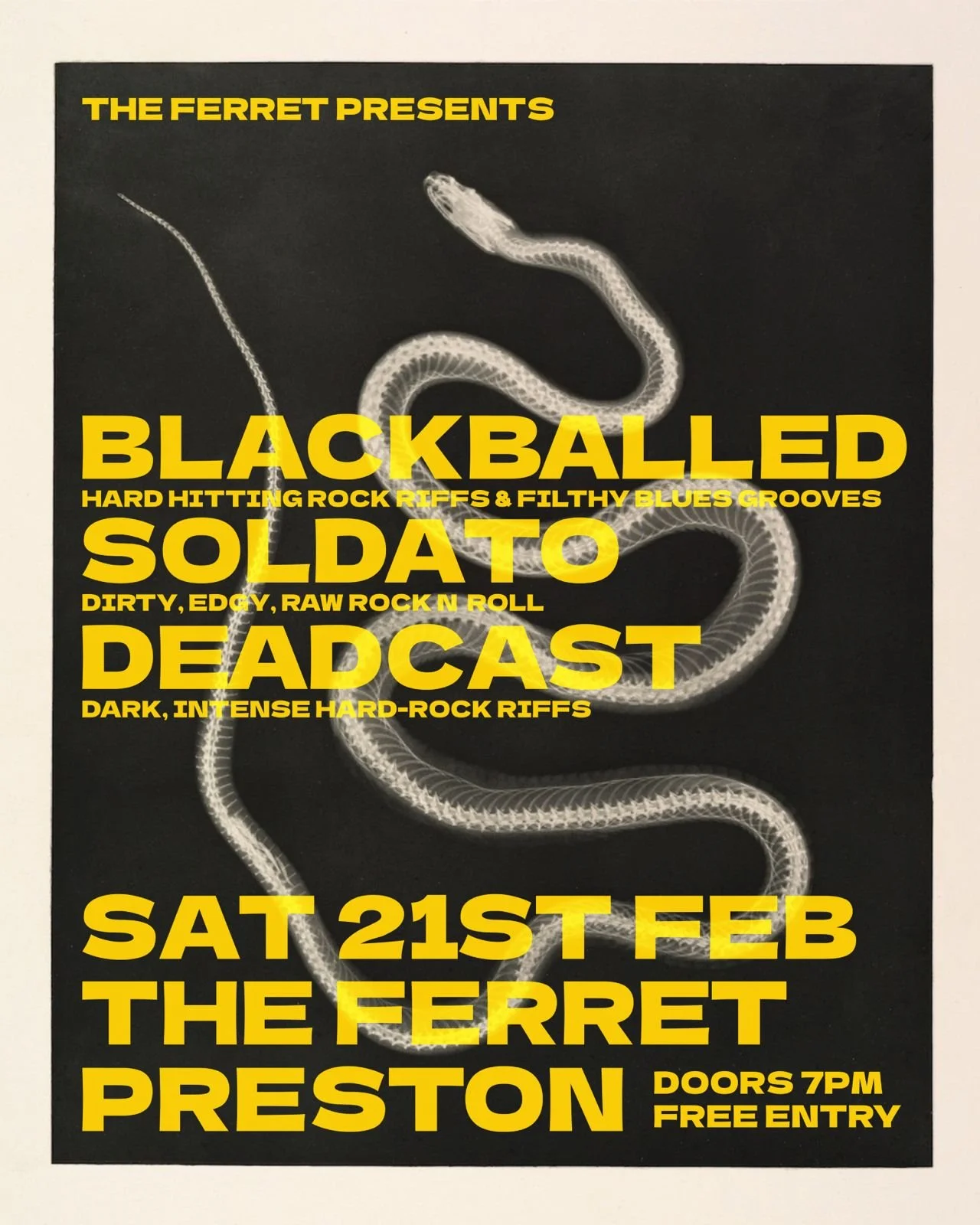Soldato is a gritty hard rock originals band formed in 2016 in Preston, UK. Known for their rhythmic heavy beats, dirty guitar riffs, and a raw, punchy rock-and-roll energy, the group quickly carved out a reputation on the UK live circuit with headlining shows and festival appearances within their first year of forming.